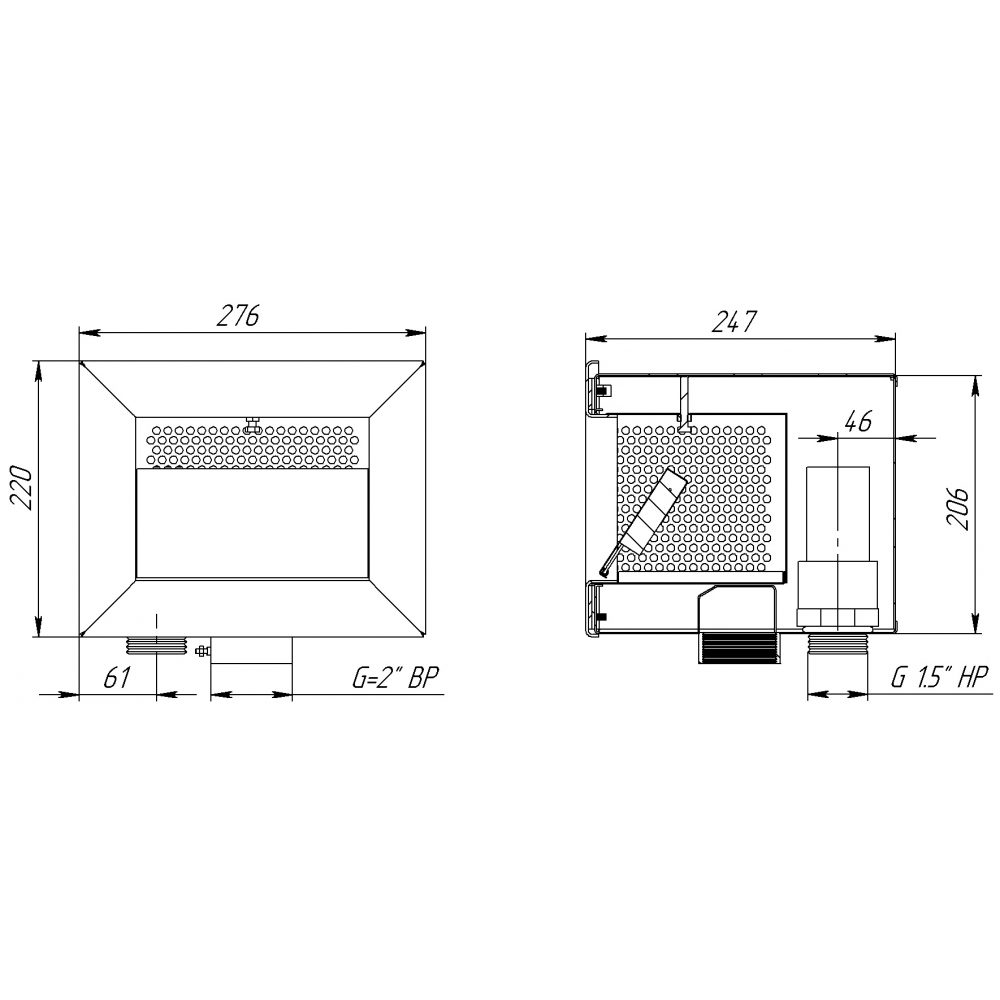 Максимальная площадь обрабатываемой поверхности – 25 м2. Скиммер устанавливается там, где нет возможности вытаскивать фильтр грубой очистки сверху. Фильтр грубой очистки ( корзина из нержавеющей стали) выдвигается вместе с лицевой панелью. Монтируется в стену. Присоединение к фильтру - внутренняя резьба 2’’.