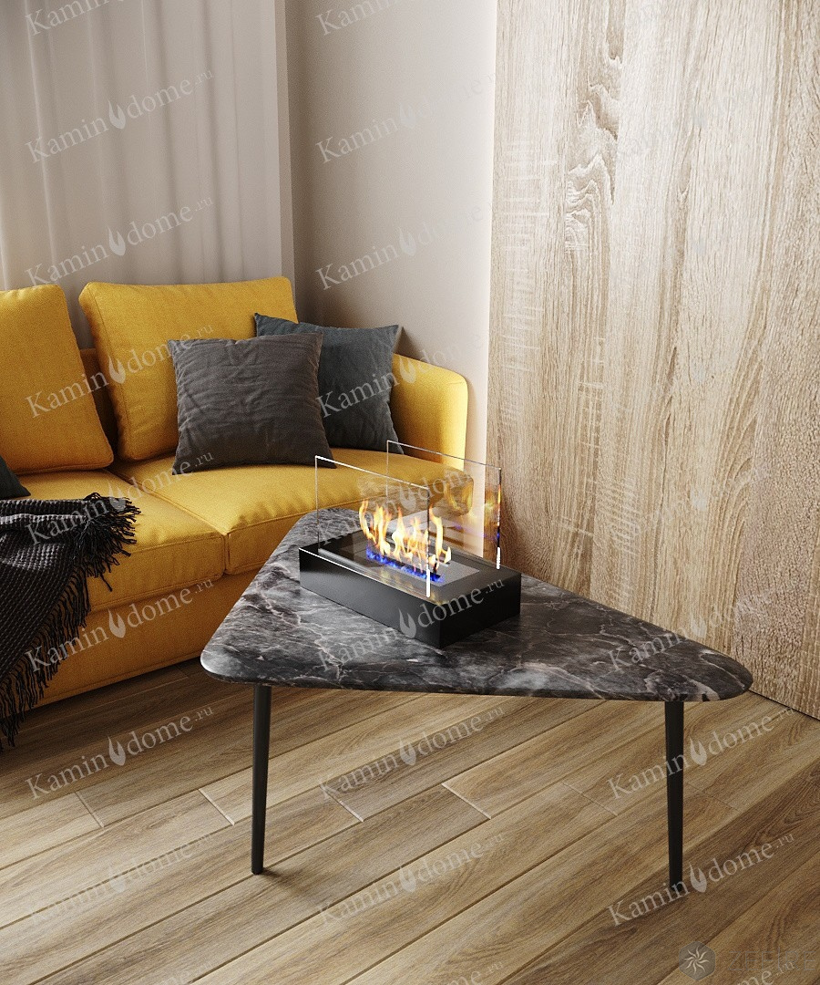 В отличие от больших устройств, миниатюрный настольный биокамин Galea можно устанавливать даже в небольших помещениях – площадью до 10 кв м. В мануальной (ручной) топке объемом 0,8 л при полной заправке огненная линия длиной 160 мм горит непрерывно 1,5-2 часа.