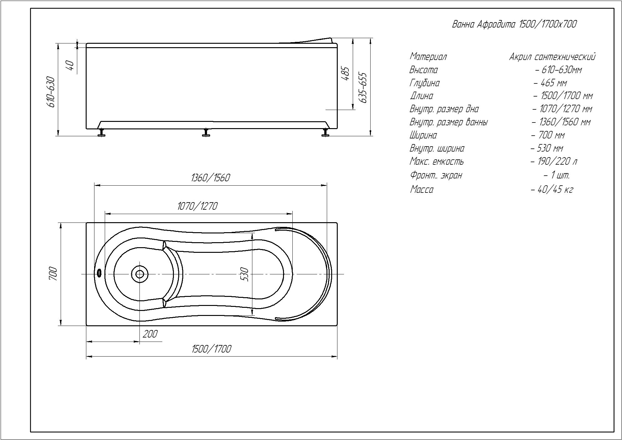 Ванна акриловая Афродита 150x70 без гидромассажа, с фронтальным экраном (слив слева)