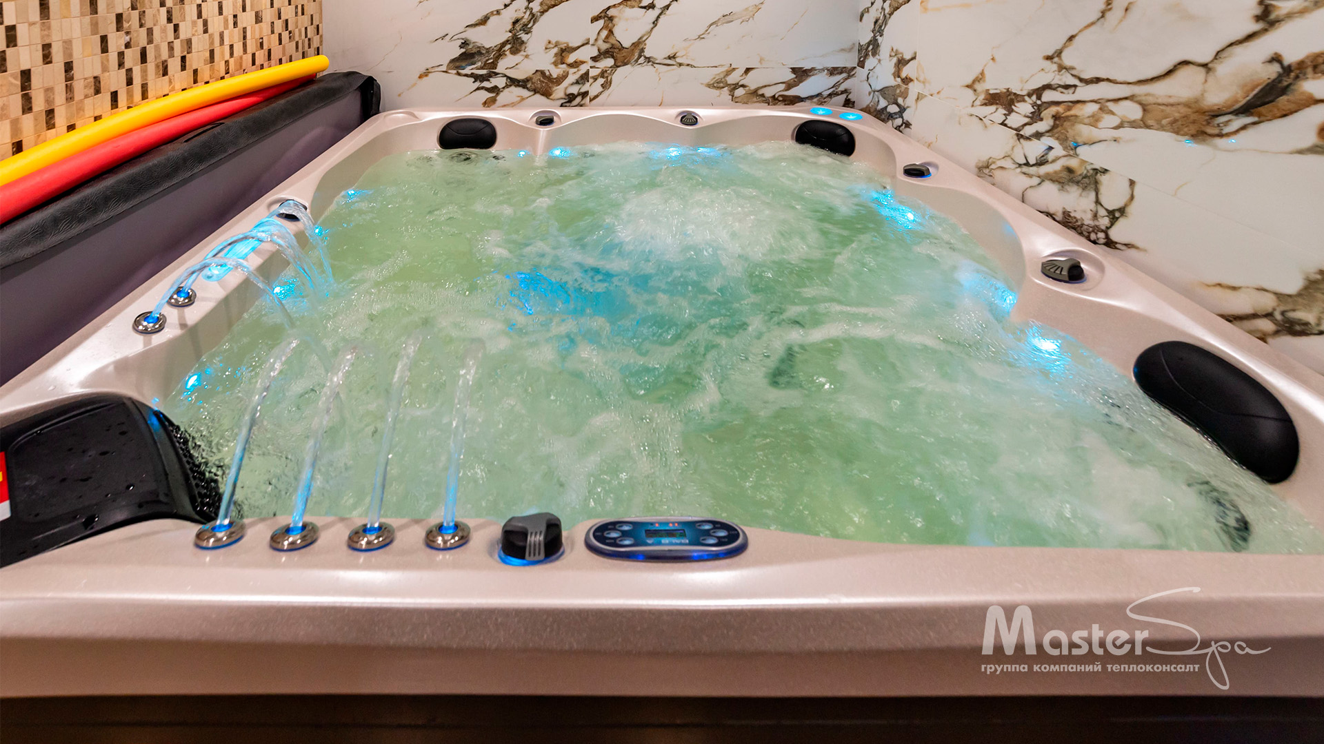 Чтобы максимально органично вписать спа-бассейн в задуманный интерьер, мы решили отказаться от готовых вариантов. Гидромассажный бассейн с аэромассажем мы изготовили сами, покрыли надежным полимер-цементным слоем и оформили мозаикой.